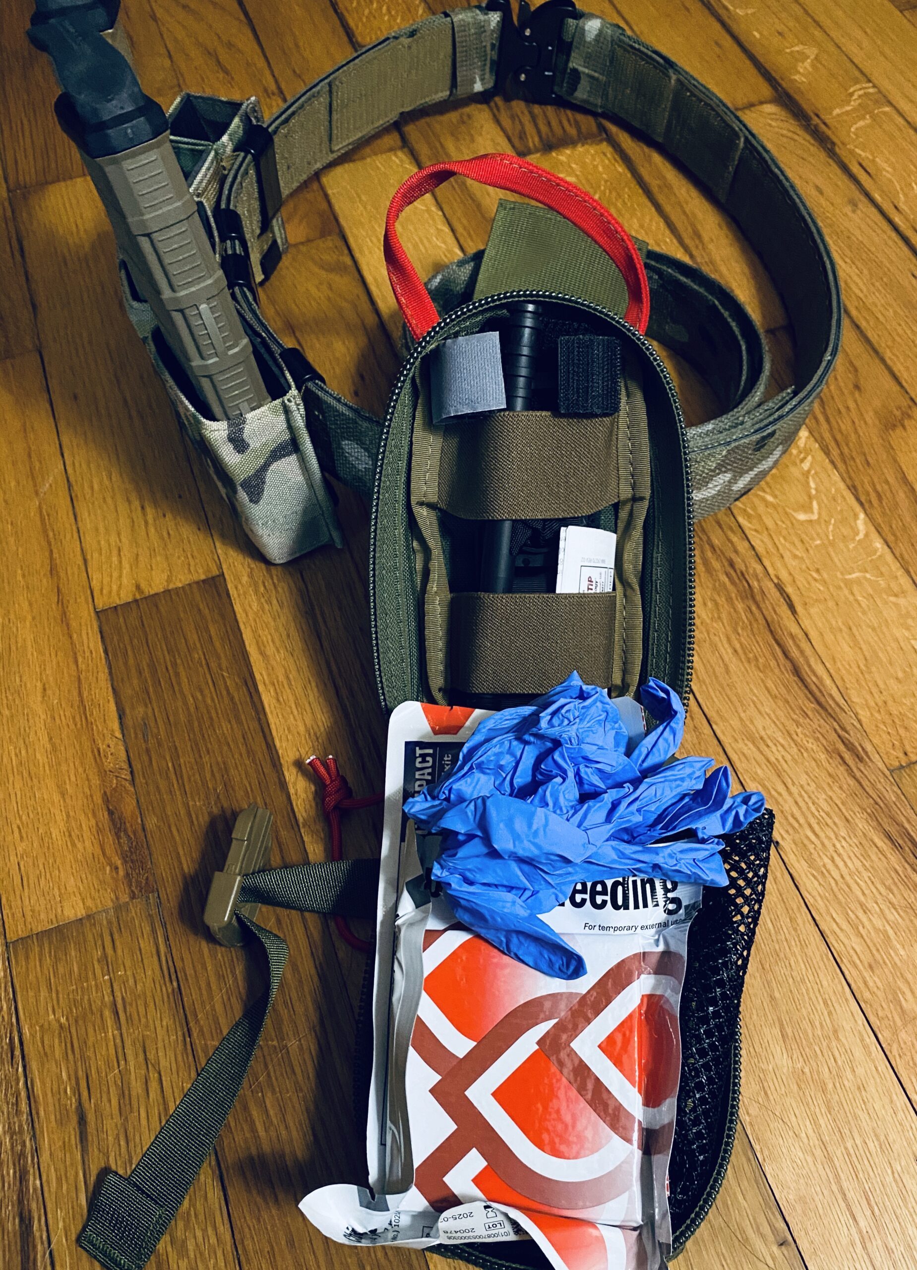 For the medical pouch, I wanted something that would be able to hold a couple of chest seals, a CAT tourniquet, and Hemostatic gauze. The DSTAC pouch by Esstac fit everything well. It zips shut and also features a clip on the front. When the clip is disengaged, the entire pouch can break away from the belt easily. I like this option because I keep it on the back of my belt, but want to be able to quickly access the kit if needed.